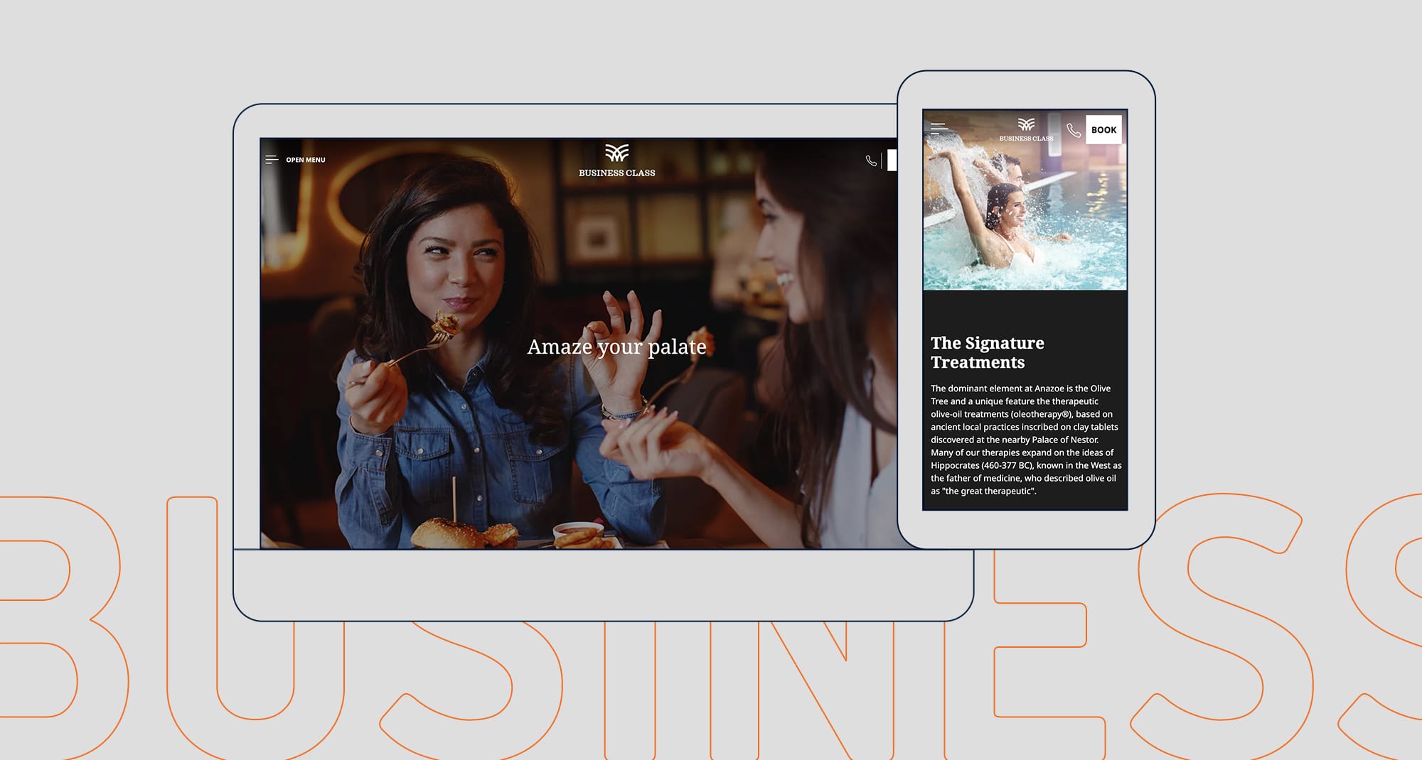 Ο σχεδιασμός του Business Class Canvas βασίζεται σε απόλυτες γραμμές που υποστηρίζουν και προβάλουν τις φωτογραφίες του καταλύματος, μεταφέροντας στον χρήστη την πραγματική εμπειρία που θα απολαύσει ένας επισκέπτης κατά τη διάρκεια της παραμονής του. Προσαρμοσμένη για υπολογιστές, tablet και smartphone, η αρχιτεκτονική της ιστοσελίδας προσφέρει εύκολη πλοήγηση επιτρέποντας στον χρήστη να εντοπίσει άμεσα τις πληροφορίες που αναζητά, είτε αυτές σχετίζονται με τα χαρακτηριστικά των δωματίων και τις επιλογές που παρέχονται για τη διαμονή του, είτε με πρόσθετες παροχές όπως φαγητό και ψυχαγωγία ή εμπειρίες και δραστηριότητες.
