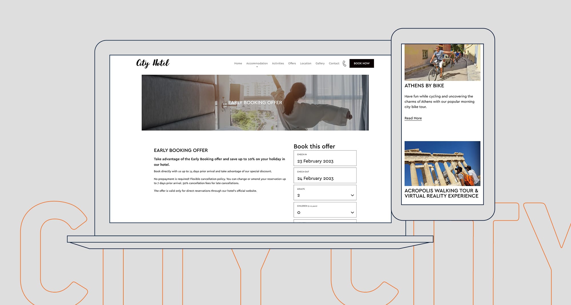 Για τα ξενοδοχεία πόλης η ισχυρή διαδικτυακή παρουσία είναι ζωτικής σημασίας για την προσέλκυση επισκεπτών. Η Hotelwize έχει αναπτύξει την ιδανική λύση για website ξενοδοχείων πόλης με το City Hotel Canvas. Το συγκεκριμένο design είναι ειδικά σχεδιασμένο για να αναδεικνύει τα μοναδικά χαρακτηριστικά των ξενοδοχείων της πόλης, συμπεριλαμβανομένων των επιλογών διαμονής, των υπηρεσιών, της τοποθεσίας και των παροχών.