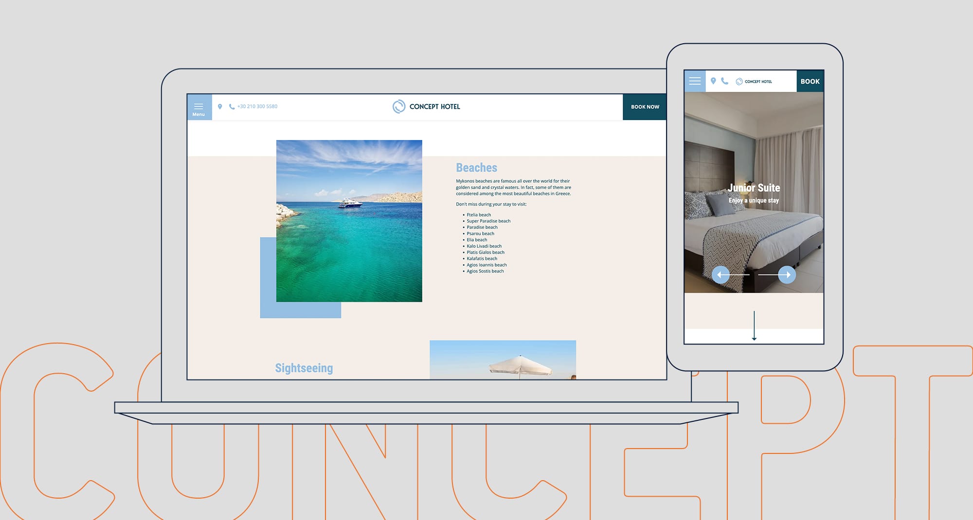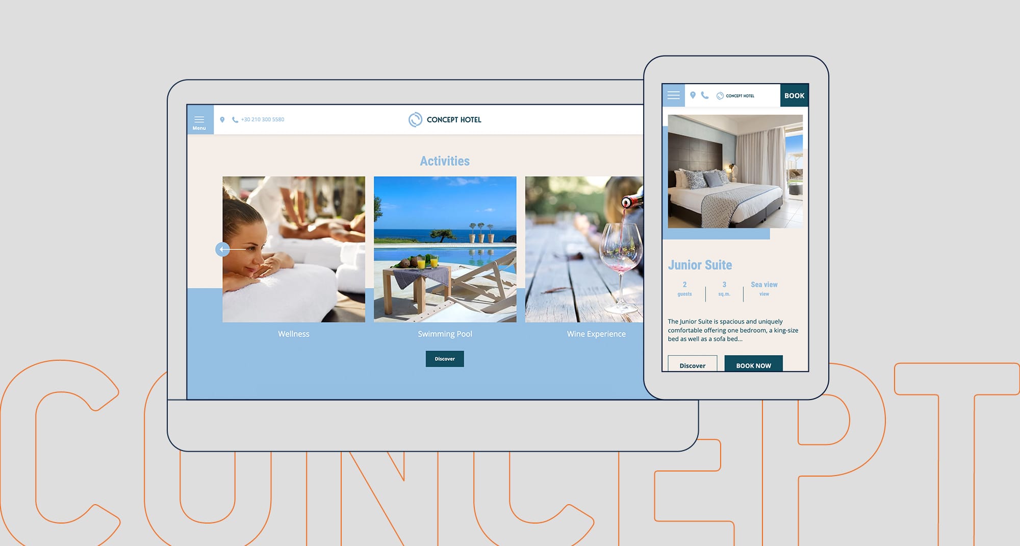 Με το Concept Hotel Canvas, αναπτύξαμε ένα design με μοντέρνα αισθητική που παράλληλα είναι άκρως λειτουργικό. Το design περιλαμβάνει banner και ειδικές σελίδες που σας επιτρέπουν να προωθήσετε τις μοναδικές εμπειρίες και δραστηριότητες του ξενοδοχείου σας, ενώ παράλληλα τονίζουν τις ανέσεις και τις υπηρεσίες του καταλύματός σας.