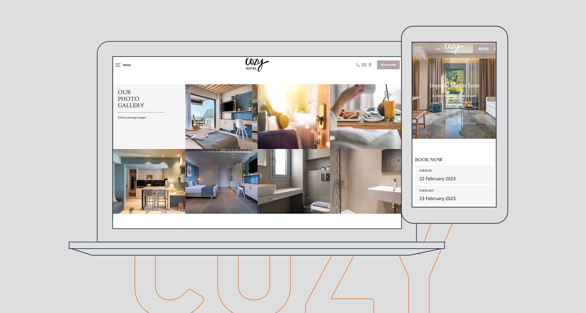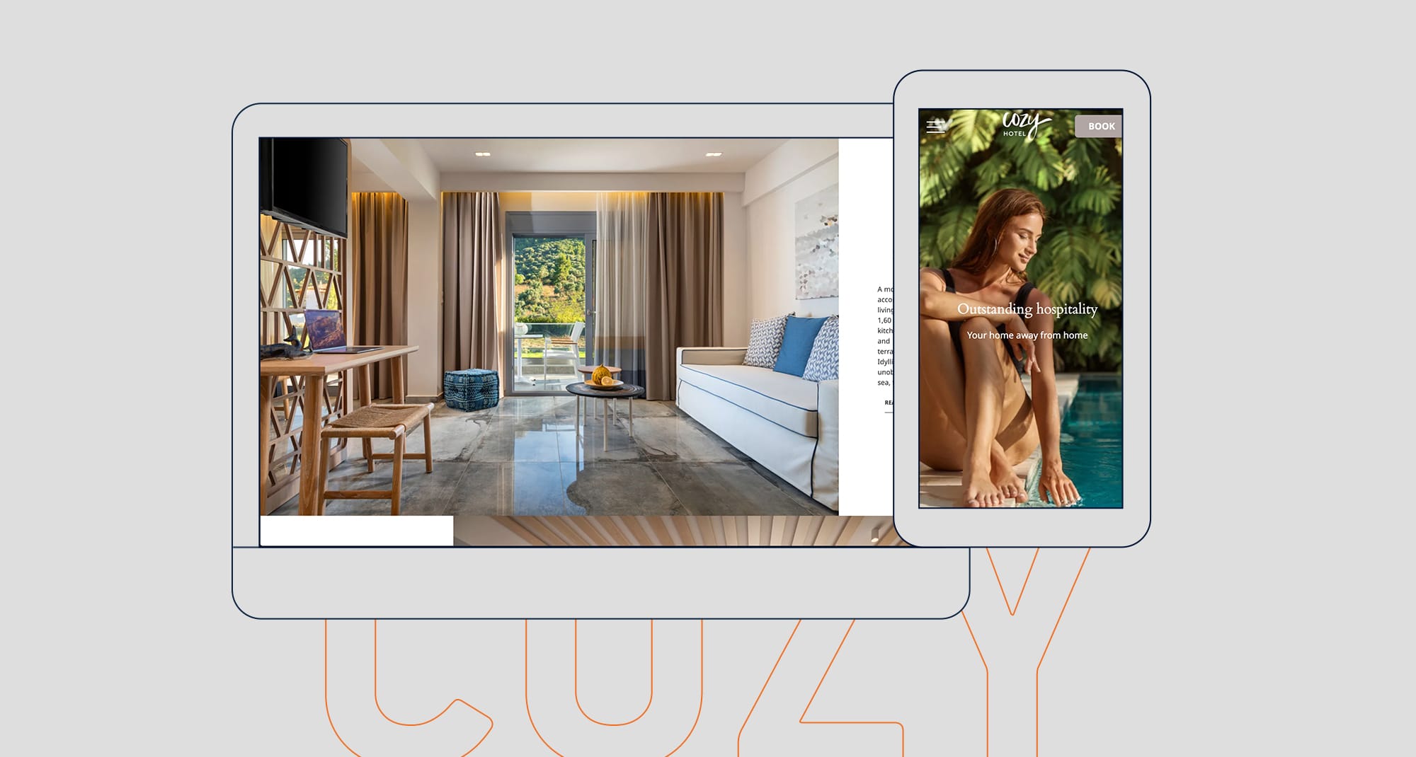 Το Cozy Hotel Canvas της Hotelwize χρησιμοποιεί λιτές στρογγυλεμένες γραμμές για να τονίσει τη μοναδική αισθητική και την κομψή απλότητα που χαρακτηρίζει τα boutique καταλύματα, ενώ ταυτόχρονα προβάλλει τυχόν ιδιαίτερα χαρακτηριστικά τους, όπως πολυτελείς παροχές, εμπειρίες ή τοποθεσία.