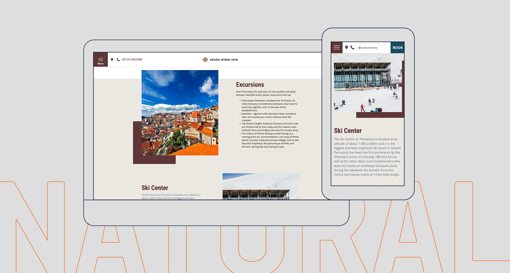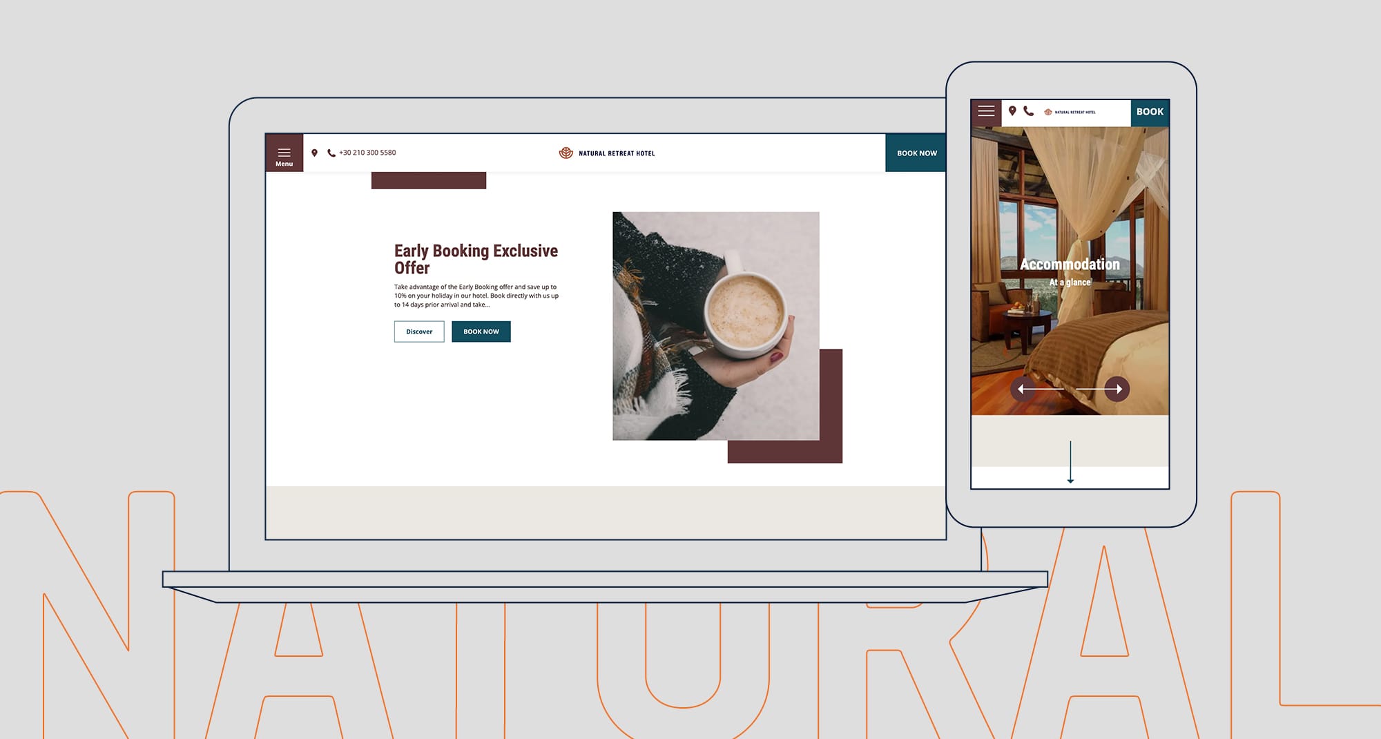 Εκτός από την αισθητική του και τη σημασία στην προβολή της τοποθεσίας, το Natural Retreat Canvas διαθέτει ξεκάθαρη δομή που ενθαρρύνει τους επισκέπτες να κάνουν κράτηση για τη διαμονή τους απευθείας μέσω της ιστοσελίδας του ξενοδοχείου. Αν ψάχνετε για έναν design για website ξενοδοχείου που να αποτυπώνει πραγματικά την ουσία του καταλύματος σας δίπλα στη φύση, το Natural Retreat Canvas της Hotelwize είναι μια εξαιρετική επιλογή.